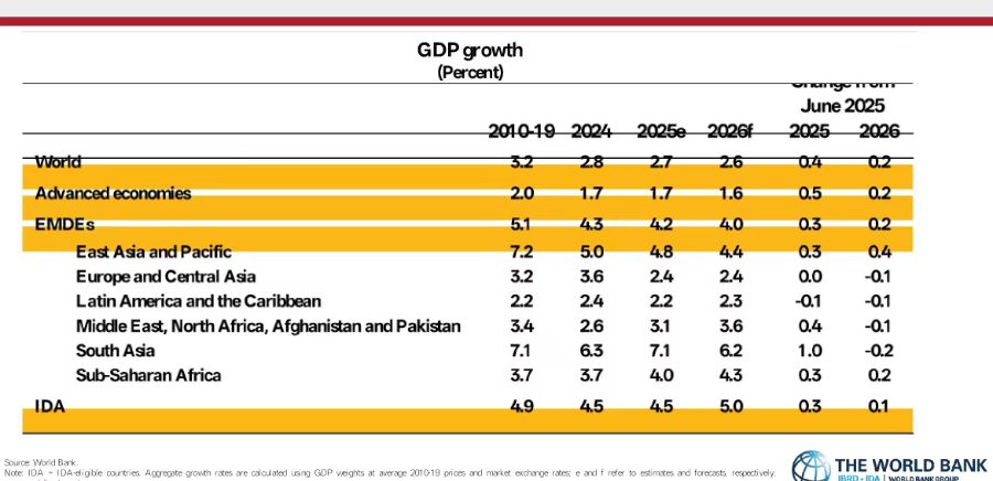 根据世界银行的预测,2026年,发展中经济体增速预计将从2025年的4.2%放缓至4%,随着贸易紧张局势缓解、大宗商品价格趋稳、金融条件改善及投资流动增强,2027年有望微幅回升至4.1%。预计低收入国家增长更快,受国内需求稳固、出口复苏及通胀趋缓支撑,2026-2027年平均增速可达5.6%。