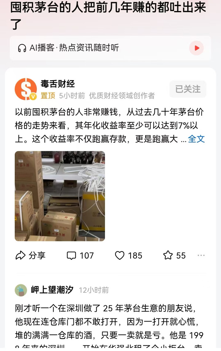 其实最近《茅台经销商血亏》的类似新闻太多了,而且还有很多茅台经销商还在亏损出货,但是对于普通消费者来说,现在假茅台太多了,谁知道这些出货的线下渠道的货是真是假呢?当初也是这些人和商家,不断炒作焦虑,网上假货多,如果想买真的,就需要加价在他们那里买。现在反噬来了!