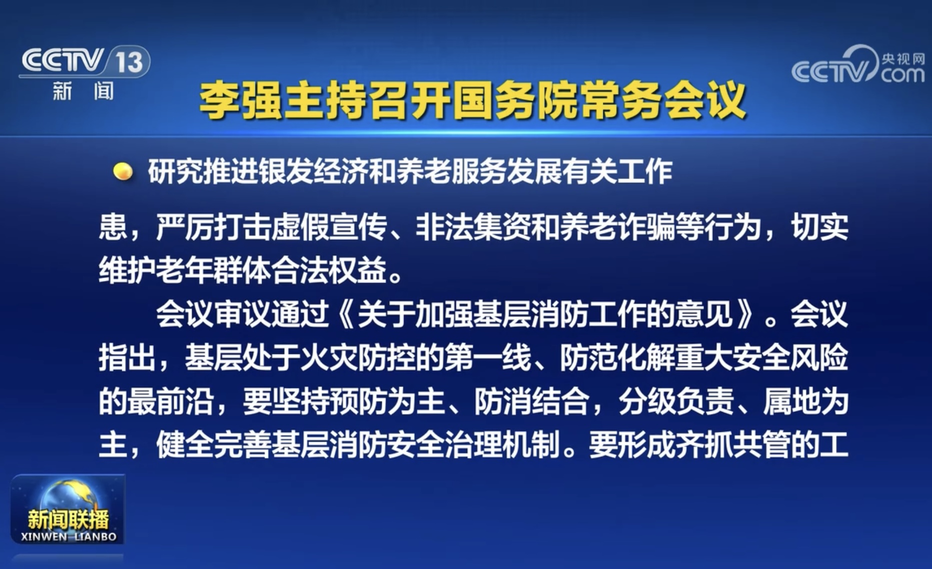 国务院常务会议要求严厉打击养老诈骗等行为。图片来源 央视