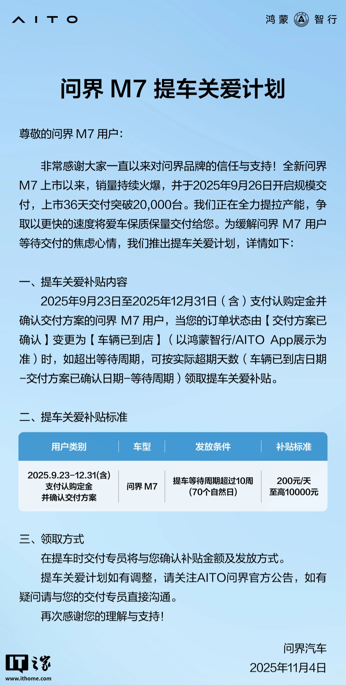 另外,鸿蒙智行官方今日还发布了问界 M7 提车关爱计划,将为提车等待周期超过 10 周(70 个自然日)的用户每天发放 200 元补贴,至高补贴 10000 元。